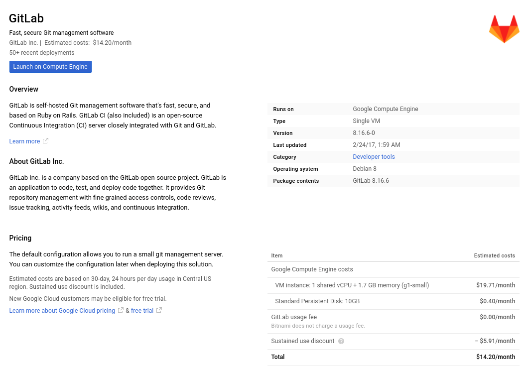In the next page, you can see an overview of the GitLab VM as well as some estimated costs. Click the Launch on Compute Engine button to choose the hardware and network settings.